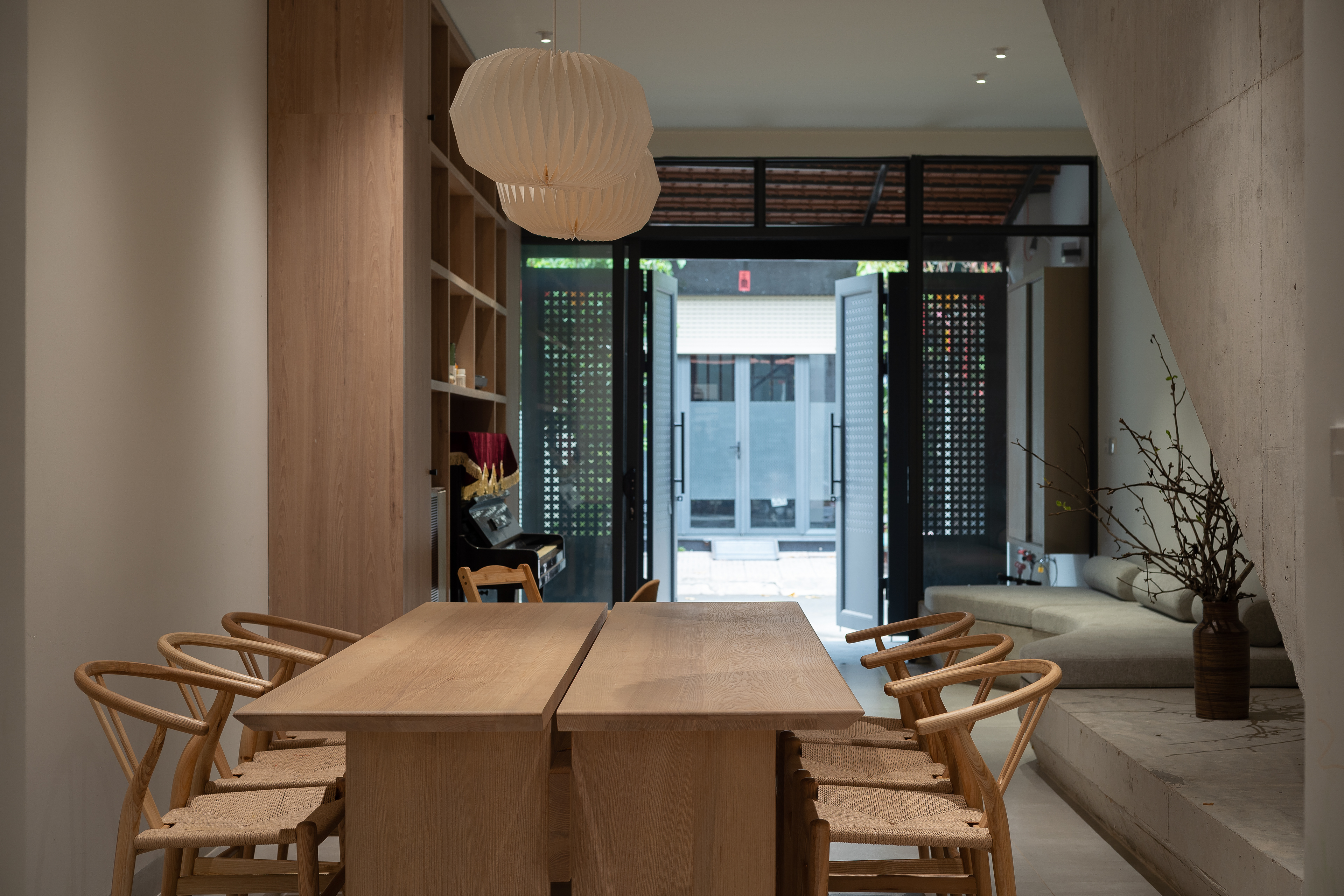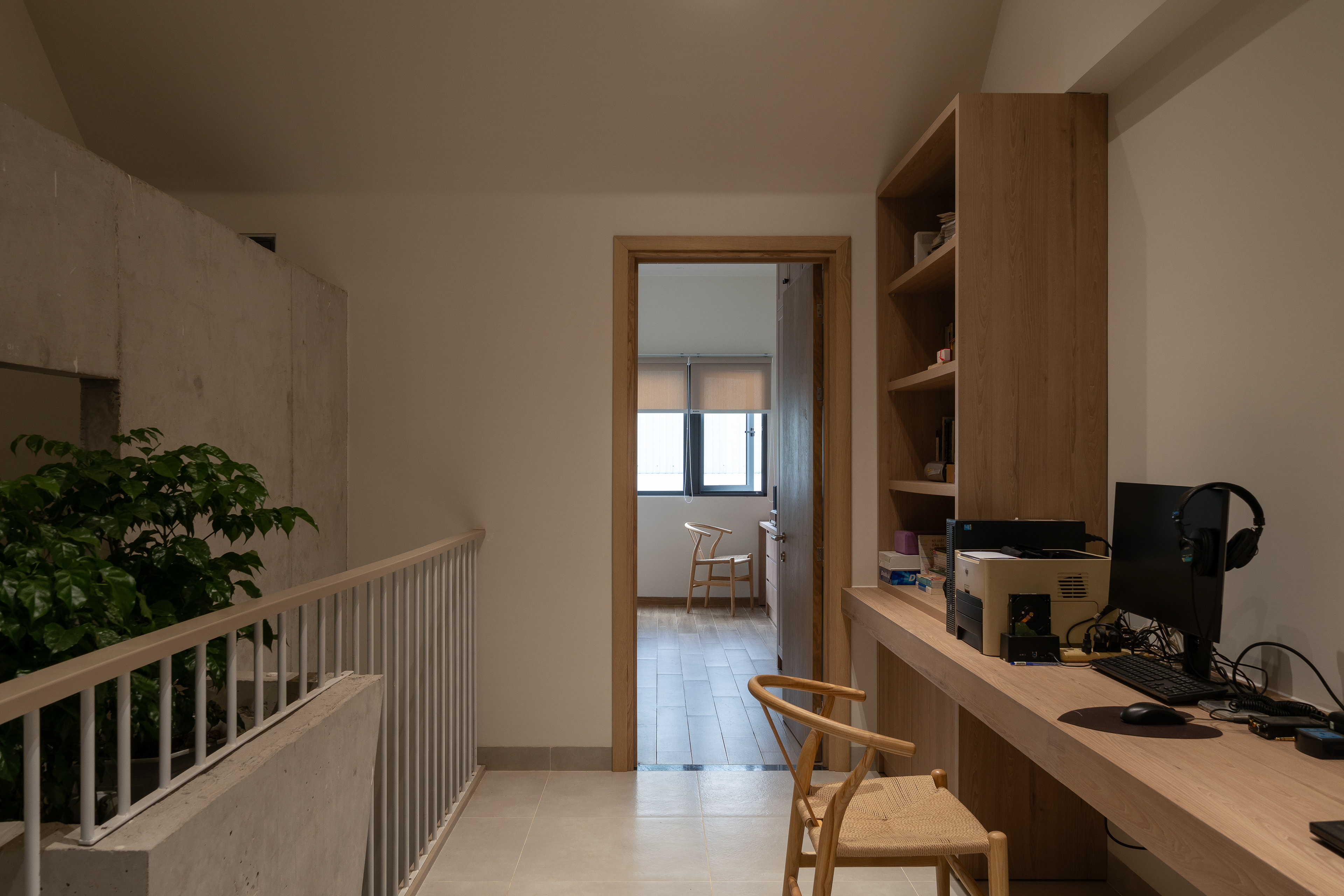 Regarding the space solution, the common living areas on the ground floor and the 2nd floor are maximally open to welcome natural light and increase connectivity. Instead of using fixed partitions, we take advantage of conventional elements such as cabinets, shelves or mezzanines to gently divide, ensuring privacy for each functional area (receiving guests, worshiping, working ...), while maintaining a seamless and airy feeling for the entire house.